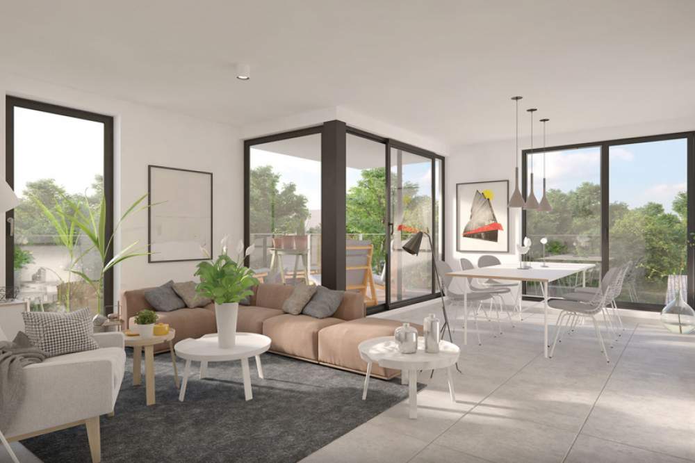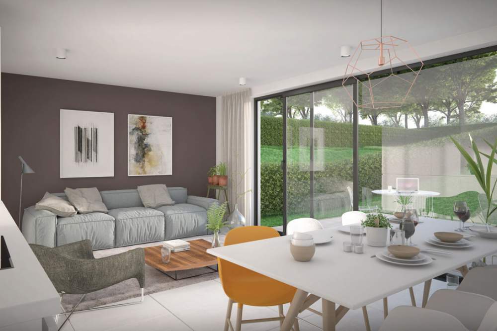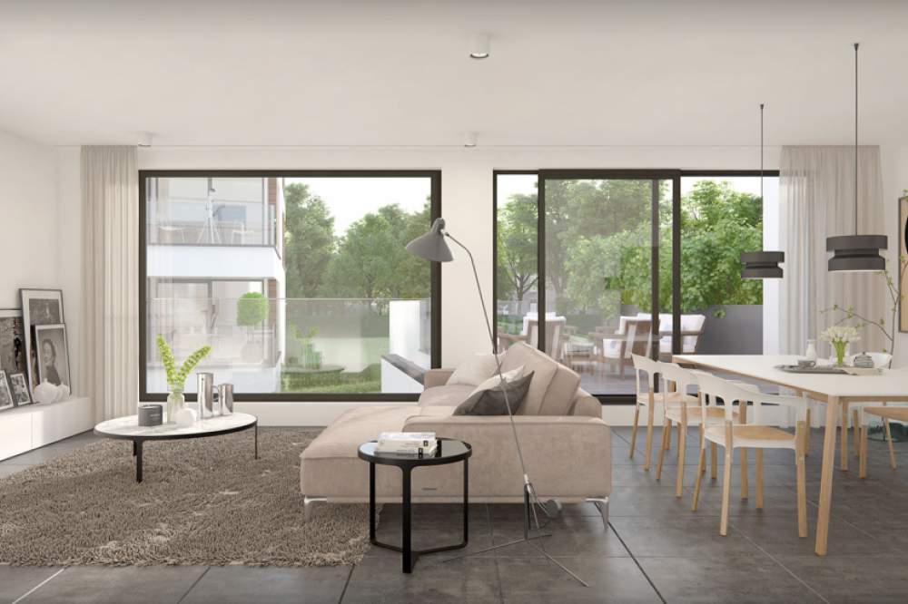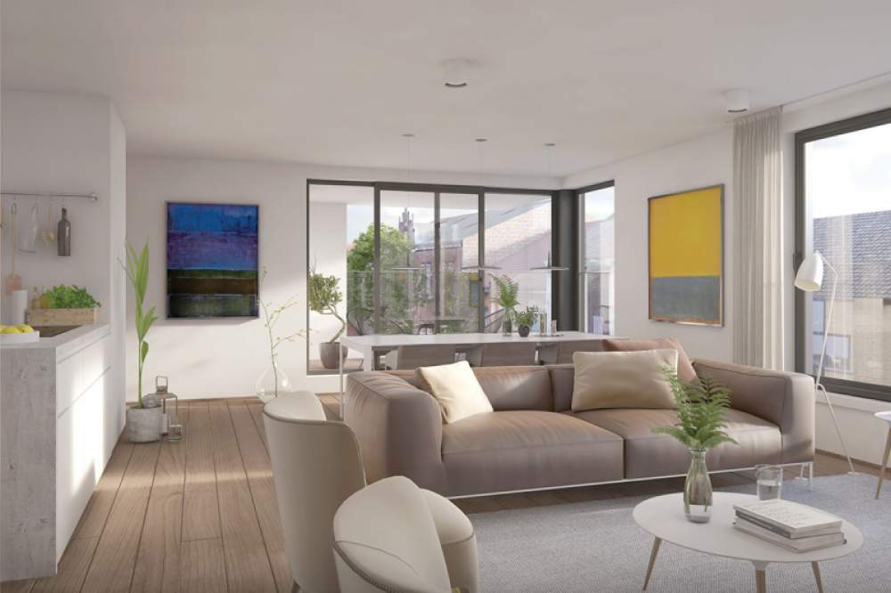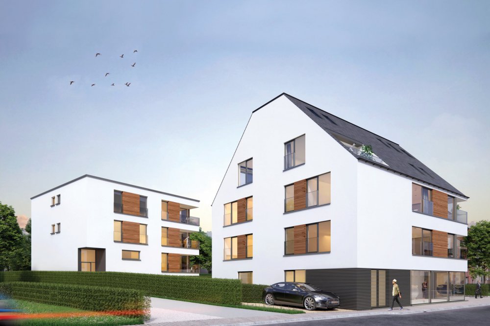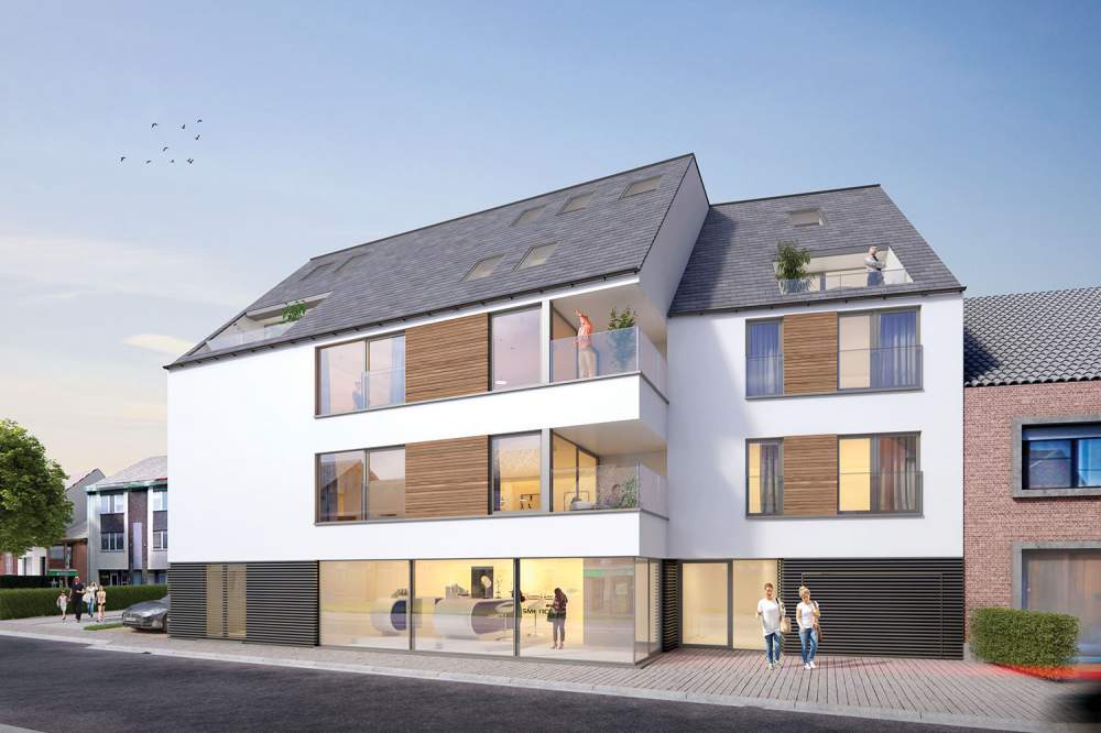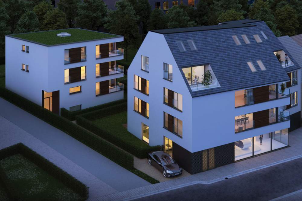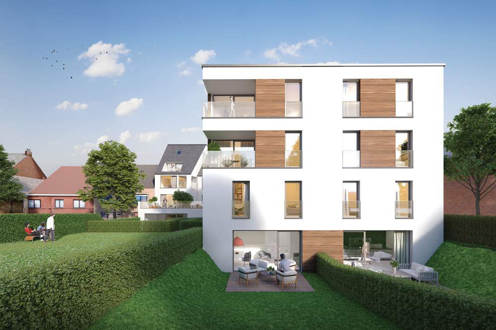 Twee gebouwen met 18 appartementen en 1 handelspand, gescheiden door private tuinen en een gezamenlijke zuidelijk georiënteerde tuin.