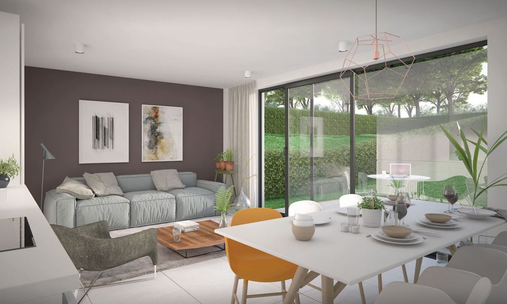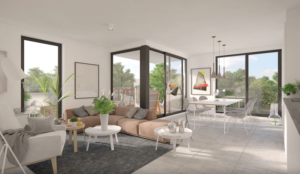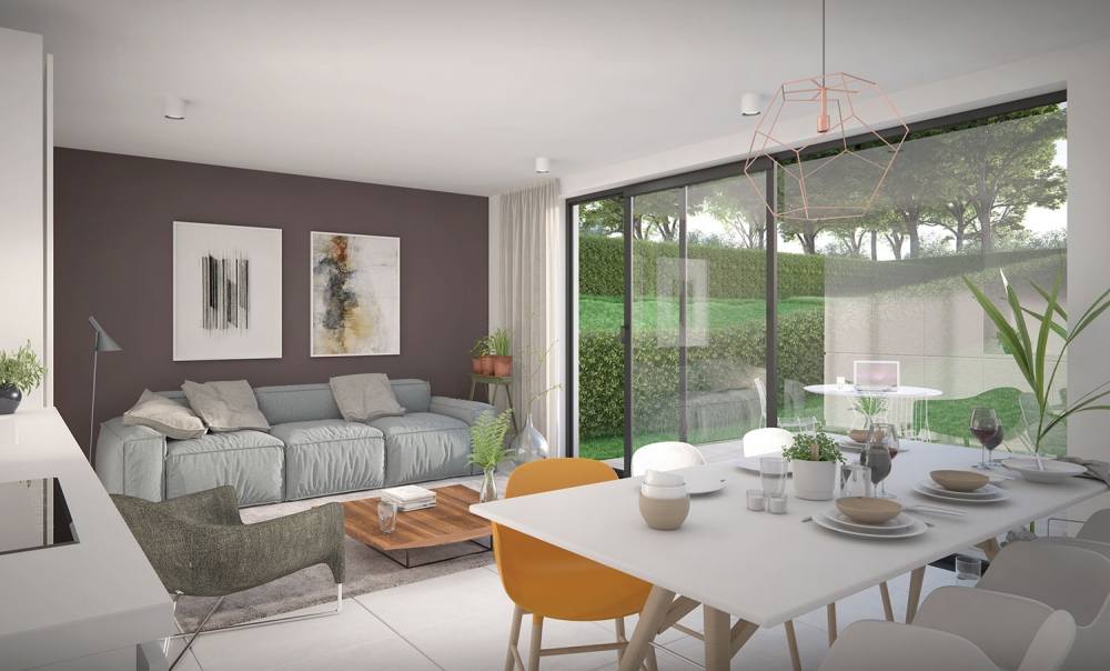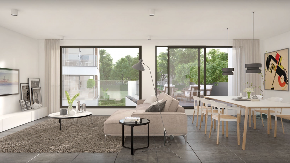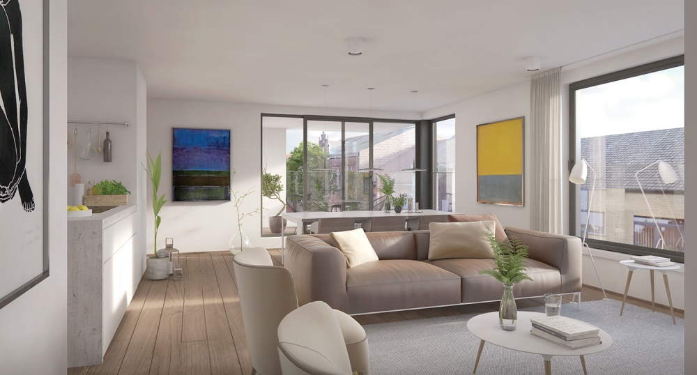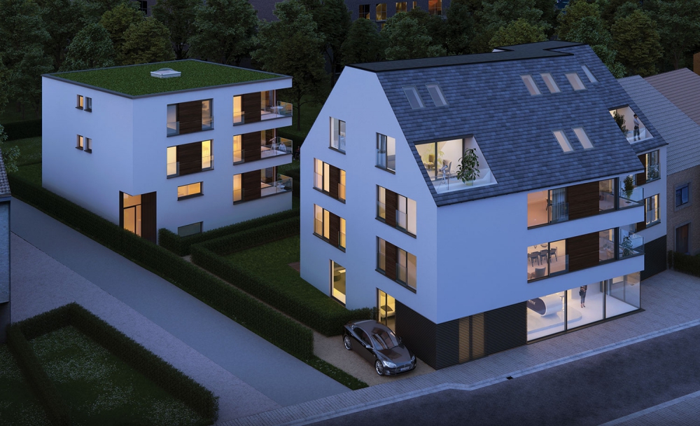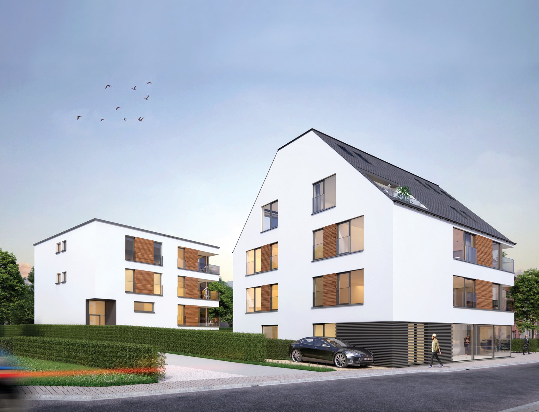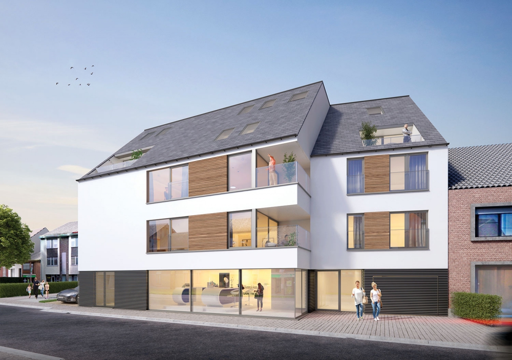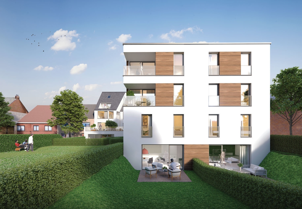 Twee gebouwen met 18 appartementen en 1 handelspand, gescheiden door private tuinen en een gezamenlijke zuidelijk georiënteerde tuin.